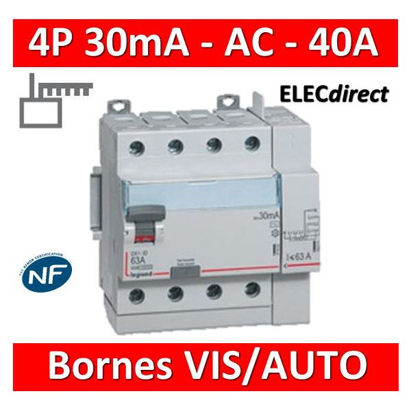 LEGRAND - Inter différentiel DX3-ID 4P 40A - 30mA - AC - Départ Haut - 5M - Réf : 411652