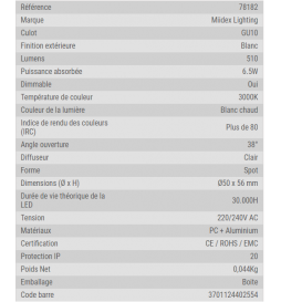 Miidex - Lampe LED 7W - Dimmable - 3000K - 510 lumens - GU10 230V - Réf : 78182